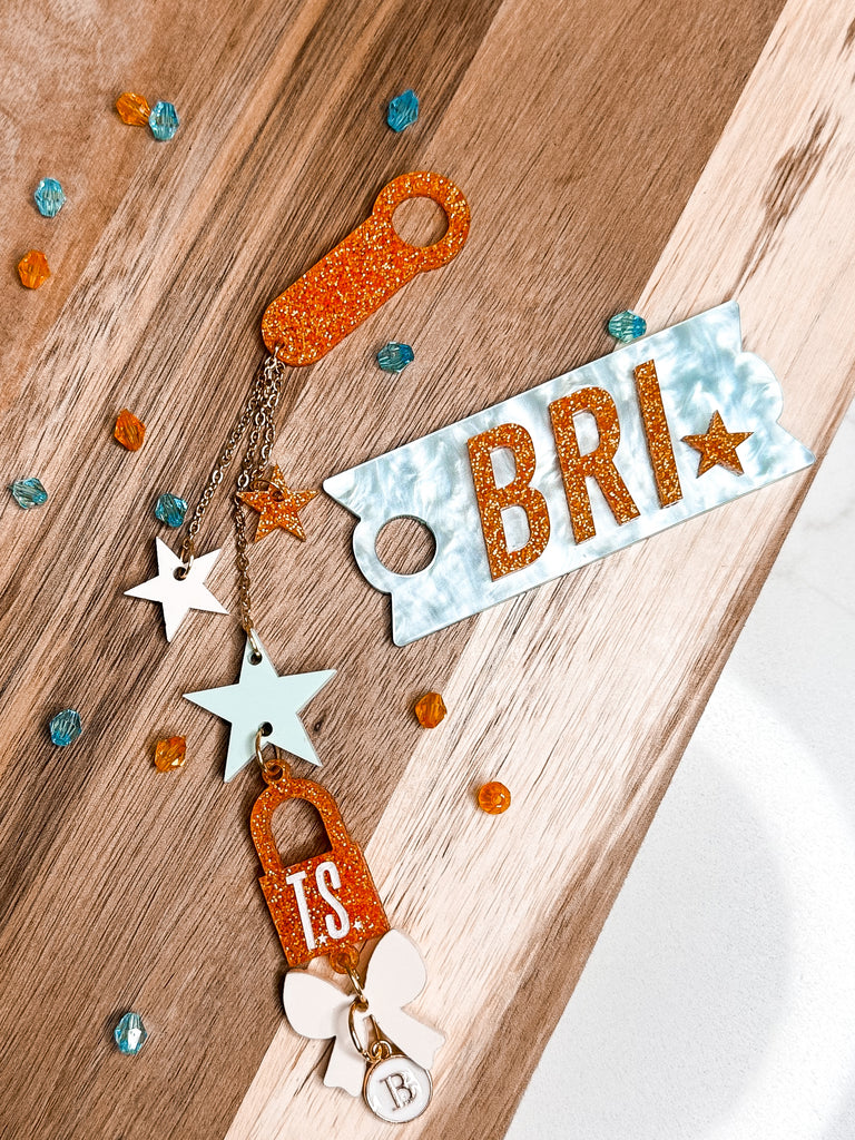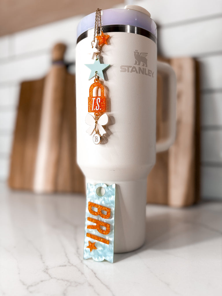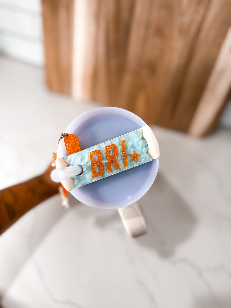 Make your Stanley tumbler truly yours with a custom name plate charm. Designed to slide right onto your cup handle, it’s made from durable acrylic with eye-catching glitter and pearl finishes. Each plate features bold lettering and fun details to keep your drinkware stylish, personalized, and easy to spot.